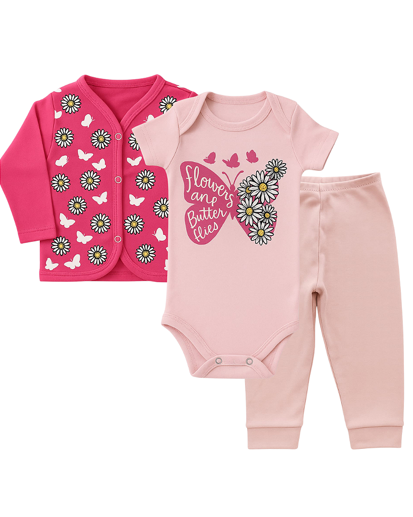 CONJUNTO 3 PEÇAS BODY E CALÇA PINK E ROSA FLORES E BORBOLETAS #Desconto progressivo
