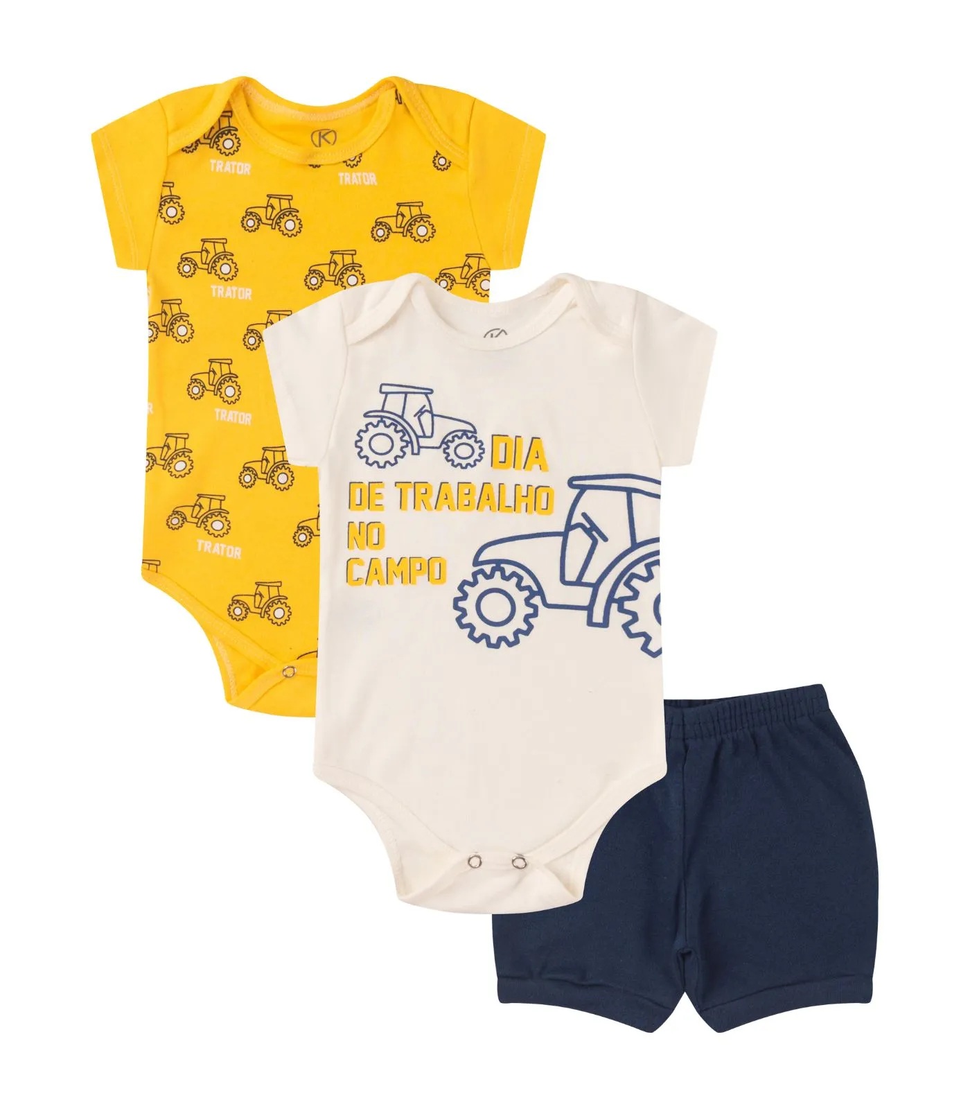 CONJUNTO 3 PEÇAS BODY E SHORT AMARELO E MARINHO TRATOR